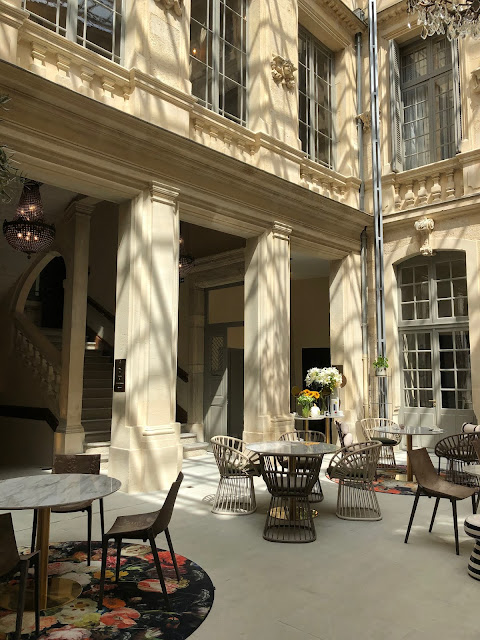 A partir d’un pavillon du début du XXe siècle assez banal, Jacques et Laurent Pourcel avaient ouvert en 1988 une table ambitieuse. Par achats successifs, ils avaient agrandi la parcelle initiale et reconstruit par tranches une partie des bâtiments. La salle de restaurant était construite à l’arrière du pavillon qui n’allait pas tarder à être détruit pour laisser place à un bâtiment à la fois plus grand et plus moderne, avec une douzaine de chambres d’hôtel luxueuses. Dû à l’architecte Bruno Borrione, alors collaborateur de Philippe Stark, le bâtiment du jardin des Sens présentait volontairement une façade sur rue assez opaque, percée d’ouvertures rares et compactes. La façade sur jardin offrait une vue très apaisante, japonisante. Je n'ai malheureusement pas pris de photos à l'époque, mais on peut s'en faire une idée sur le site de Midi Libre ici.